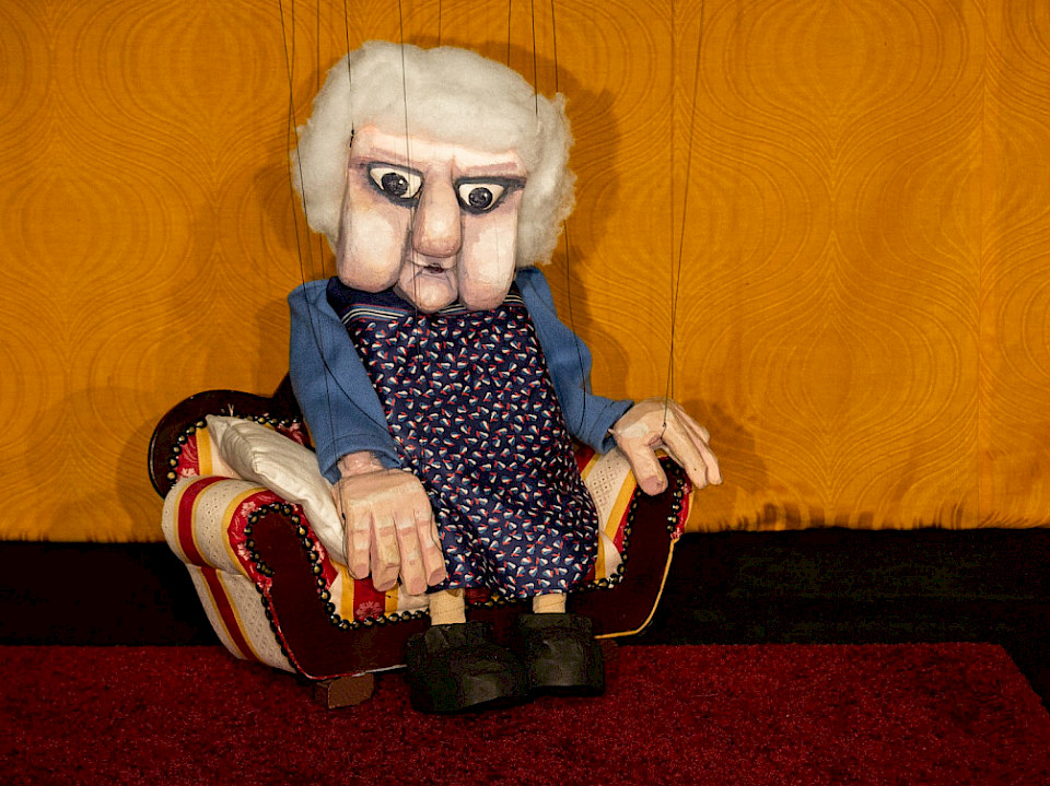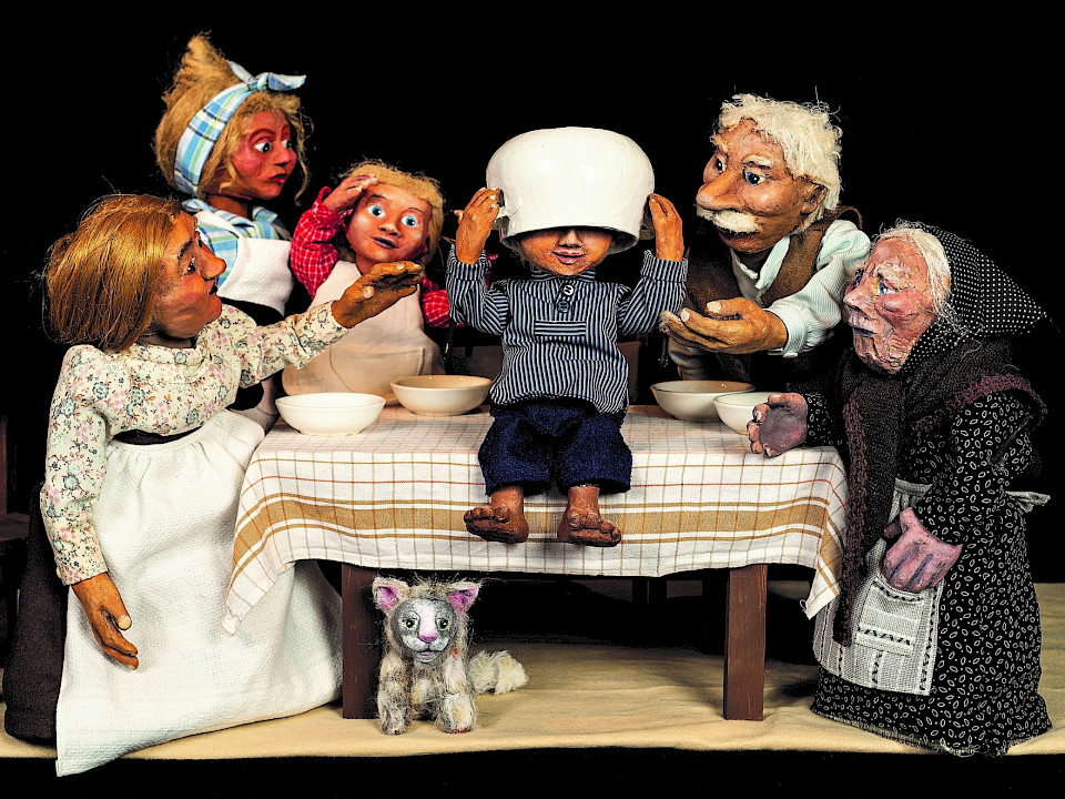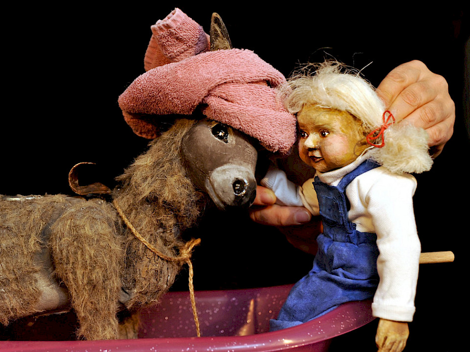 Liebevoll inszeniertes Theaterstück mit 2 Tischfiguren und mit Schwarzweißfiguren aus Papier