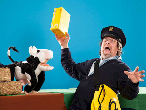 Die Postkuh Lieselotte und der Postbote müssen viele Postkarten und Pakete ausgetragen.