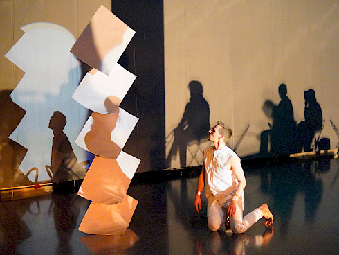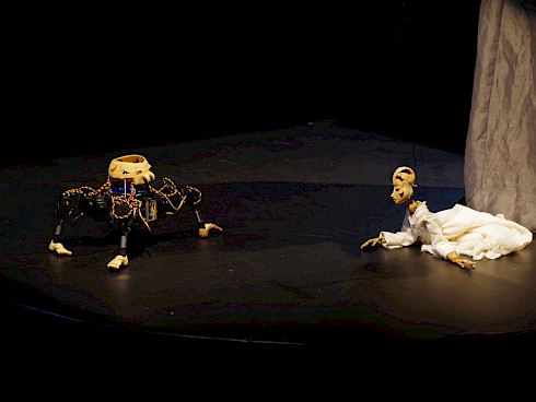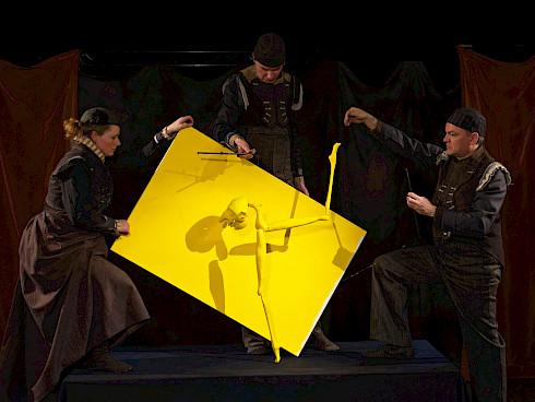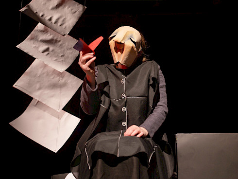 Die Visualisierung durch Alice Therese Gottschalk erfolgt über Masken, Marionetten und Material. Das Immaterielle bekommt damit eine Entsprechung im Materiellen. Symbolhaftes versinnbildlicht das dramatische Moment.
