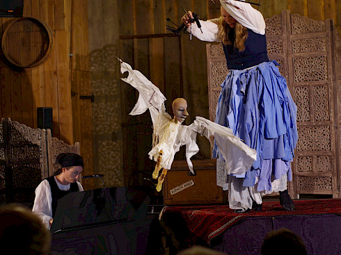 Ausdrucksstarke Masken zeigen Ringelnatz in seinen unterschiedlichen Facetten: Ringelnatz als Kabarettist, Ringelnatz als Liebhaber, Ringelnatz als der heimatlose Matrose, Ringelnatz als das ewige Kind… Die ungewöhnlichen Marionetten und Handpuppen treten in den Dialog mit der Darstellerin - ein Spiel zwischen Abhängigkeit, Führung und führen lassen entsteht.