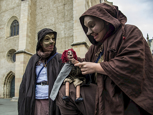 An einem verborgenen Platz warten zwei Halunken, die Euch mitnehmen auf eine Reise in die Vergangenheit. Aus den Mänteln dieser beiden tauchen nach und nach fabelhafte Figuren auf, die Euch aus der Sagen- und Geschichtenwelt der Stadt Halle erzählen.