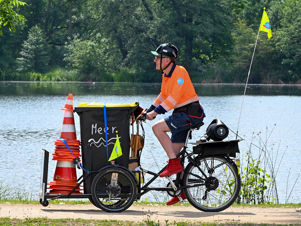 Was hat ein Lastenrad zum Müllsammeln mit dem Grimm-Märchen „Vom Fischer und seiner Frau“ zu tun? Zunächst wenig. Außer der Müllsammler ist auch Puppenspieler, denn dann beginnen Unrat, Lastenrad und Verkehrskegel selbst ganz schnell zu Objekten zu werden, mit denen sich vortrefflich Theater spielen lässt! Und wer das Märchen kennt, erinnert sich möglicherweise an die zerstörte Umwelt und die stinkende See am Ende. Manch öffentlicher Platz in Nürnberg (und anderswo in der Welt) wirkt, als wären wir auch schon fast am Ende. Als hätten unsere Gier nach mehr und das permanente Erfüllen unserer Bedürfnisse uns an einen Punkt gebracht, wo „die See zu kippen droht“.